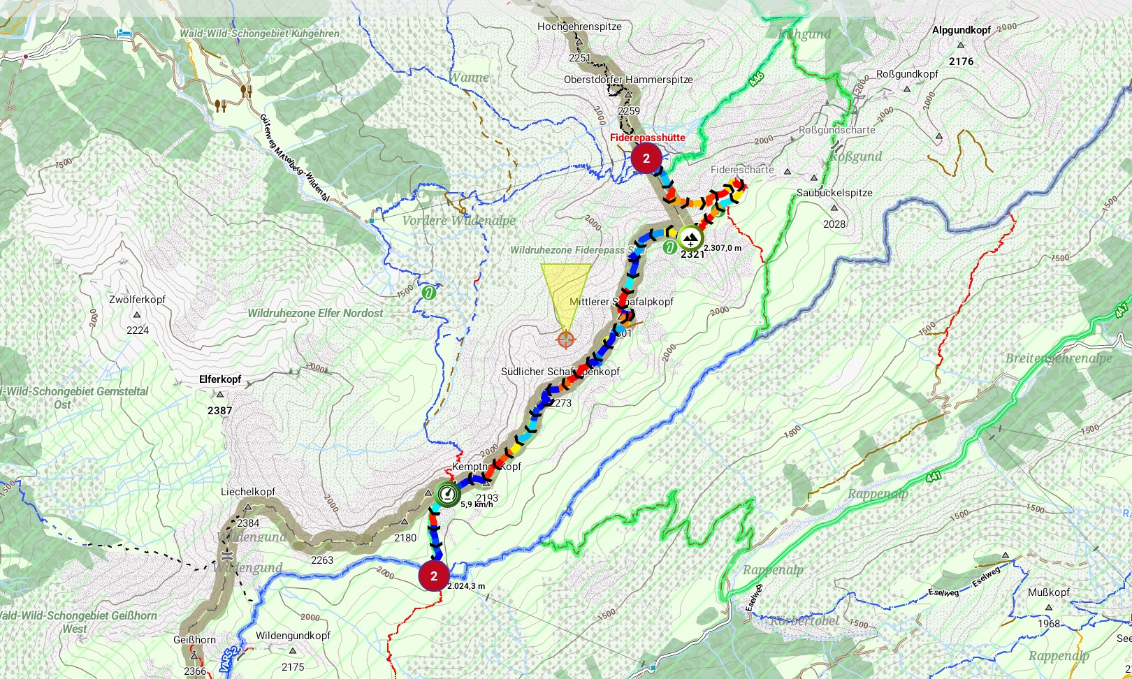 Der Kemptner Kopf (2191m) ist am Ende noch ein richtiges Highlight. Der ansonsten grüne Berg ist oben mit einem felsigen Krönchen geschmückt. Ein echter Hingucker. Er ist bereits von weitem zu sehen und muss am Ende gibt es obendrein noch eine kleine Klettereinlage zum Gipfelkreuz.