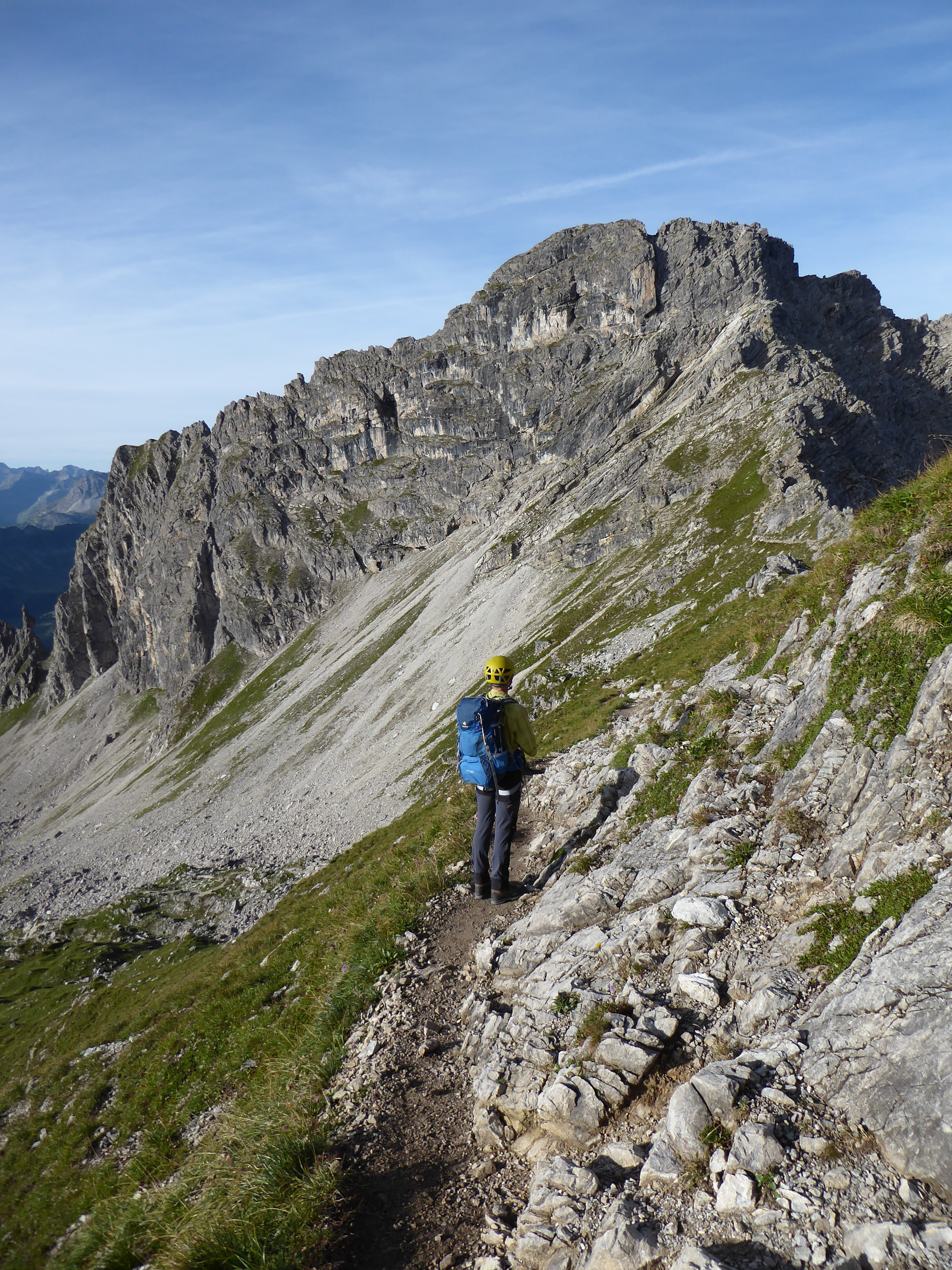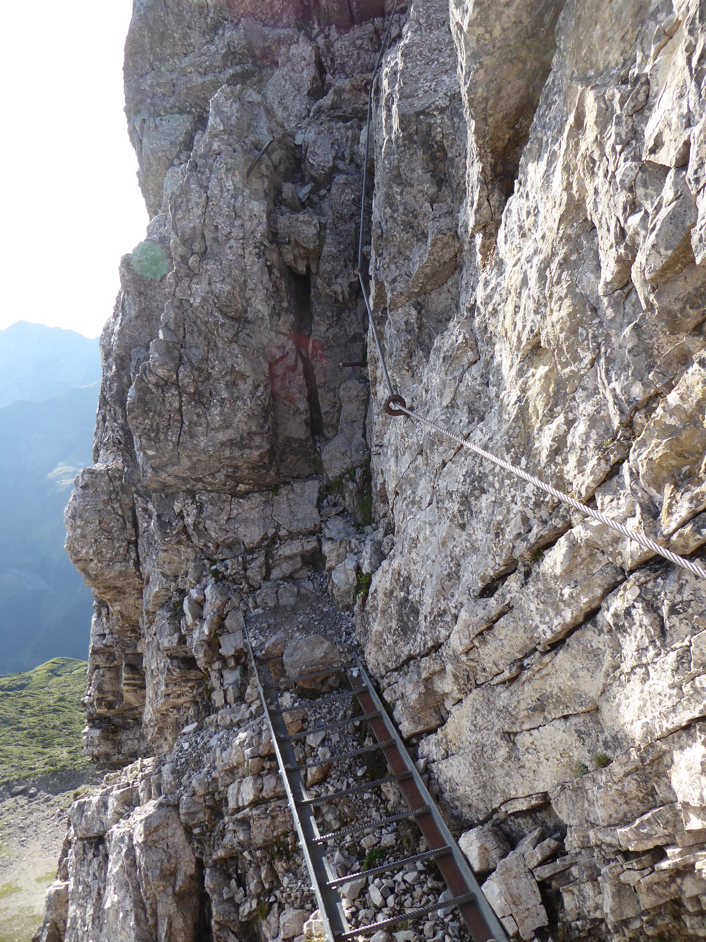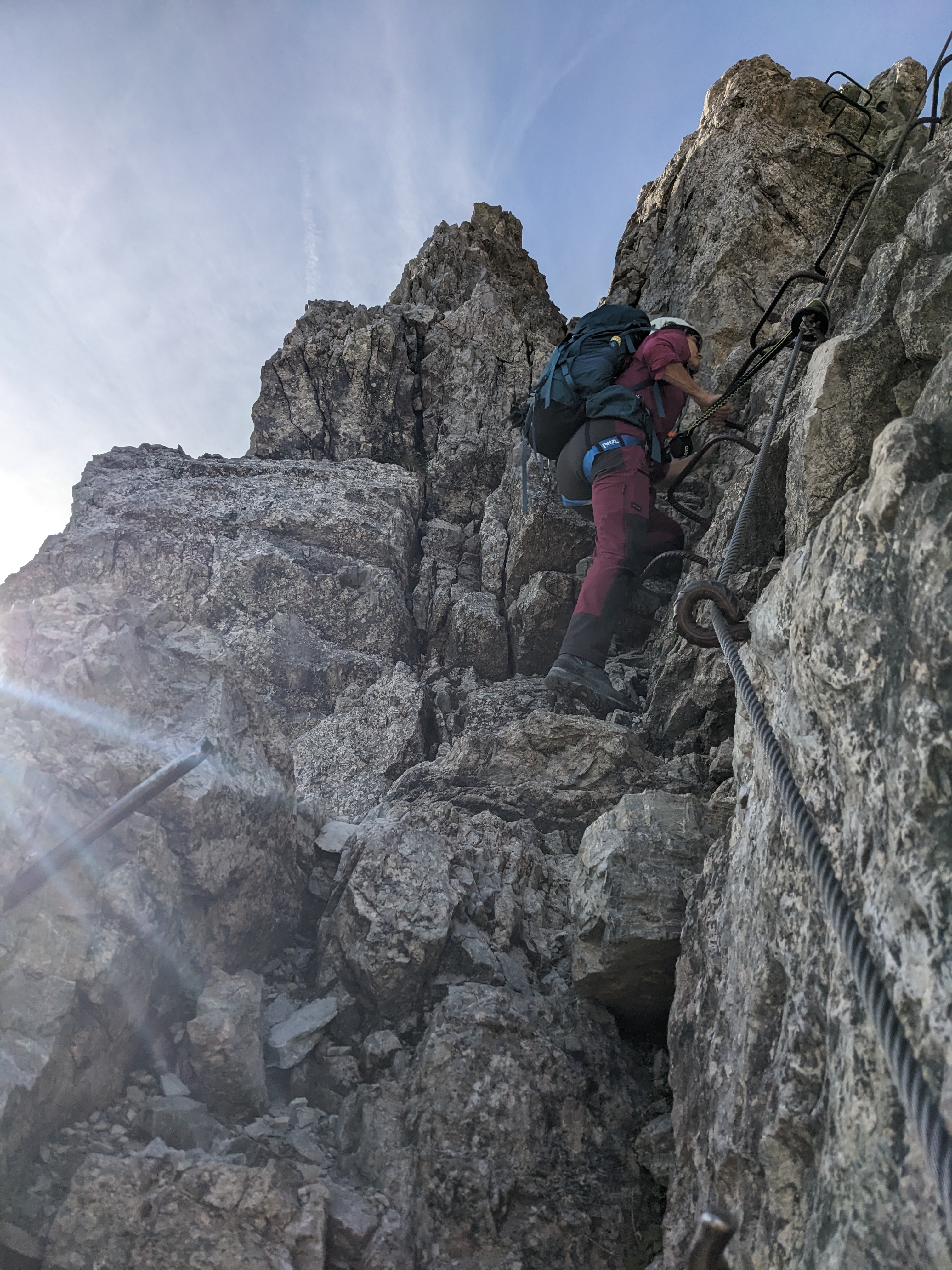 Gut gefrühstückt geht es um 8:30 Uhr zunächst über einen Geröllhang hinauf zur Fiderescharte. Hier ziehen wir unsere Klettersteigsets an. Etwas zu früh, wie sich herausstellt, denn das dort befindliche Stahlseil markiert noch nicht den Klettersteig. Der beginnt erst ein gutes Stückchen weiter.