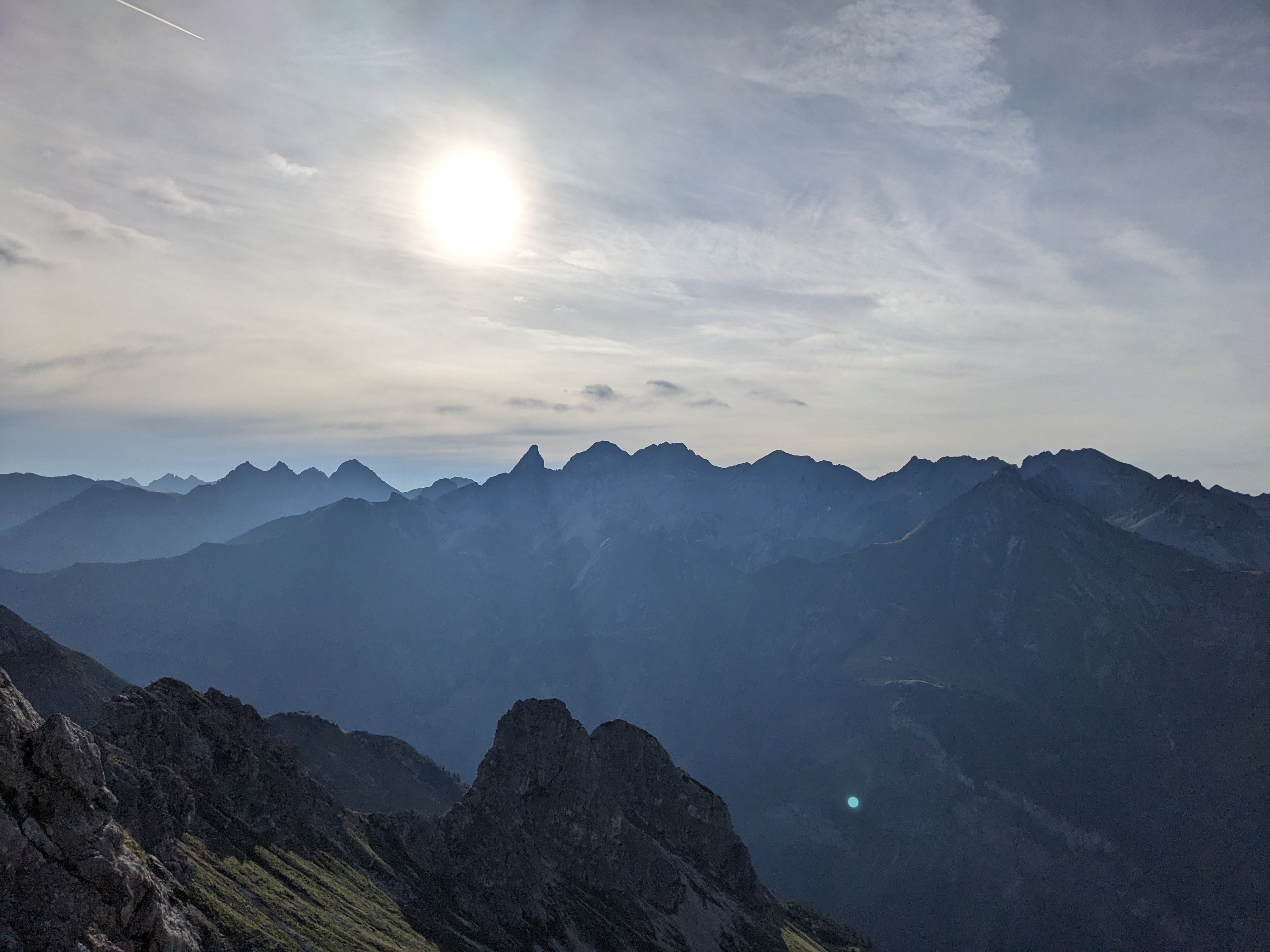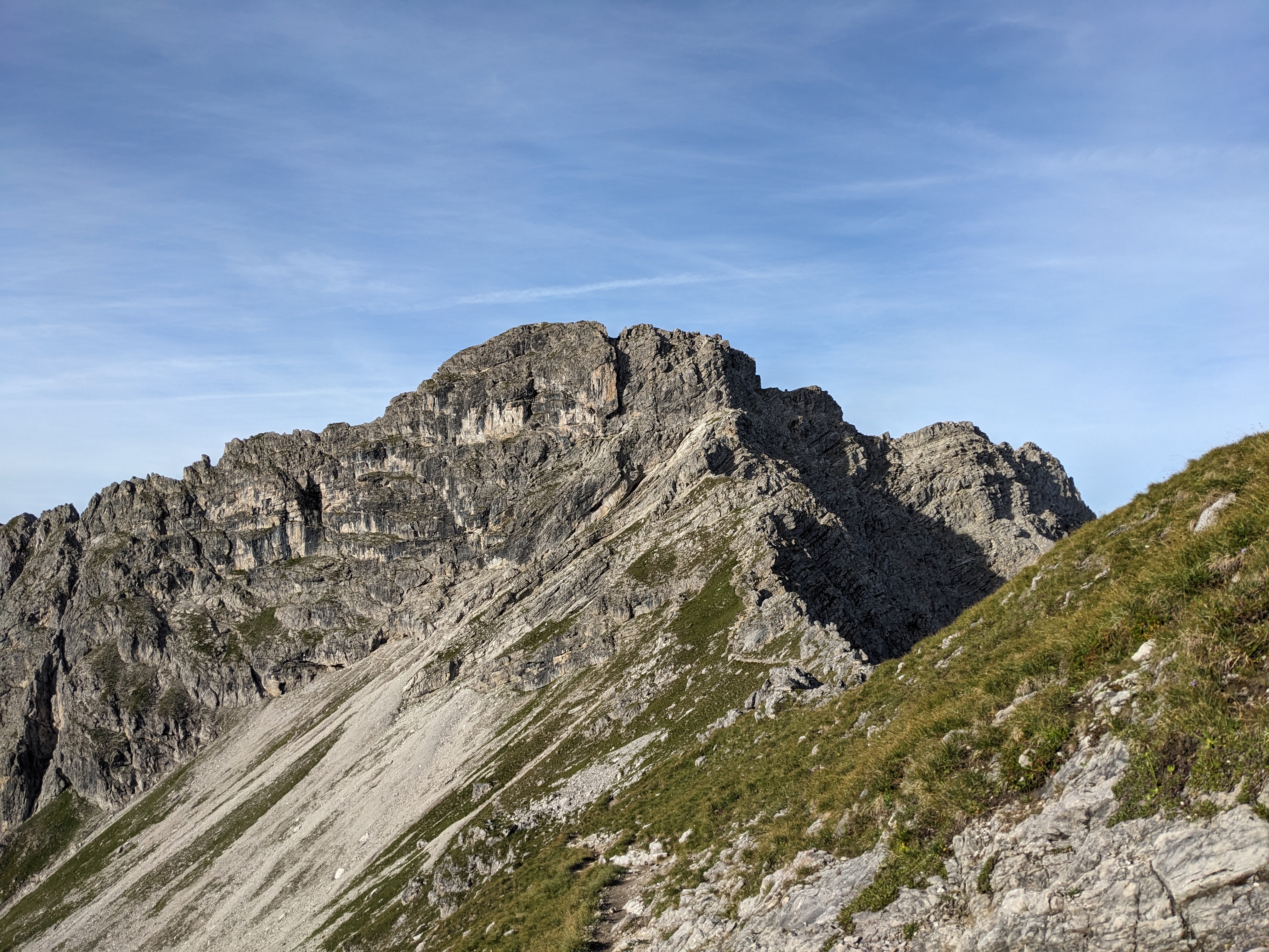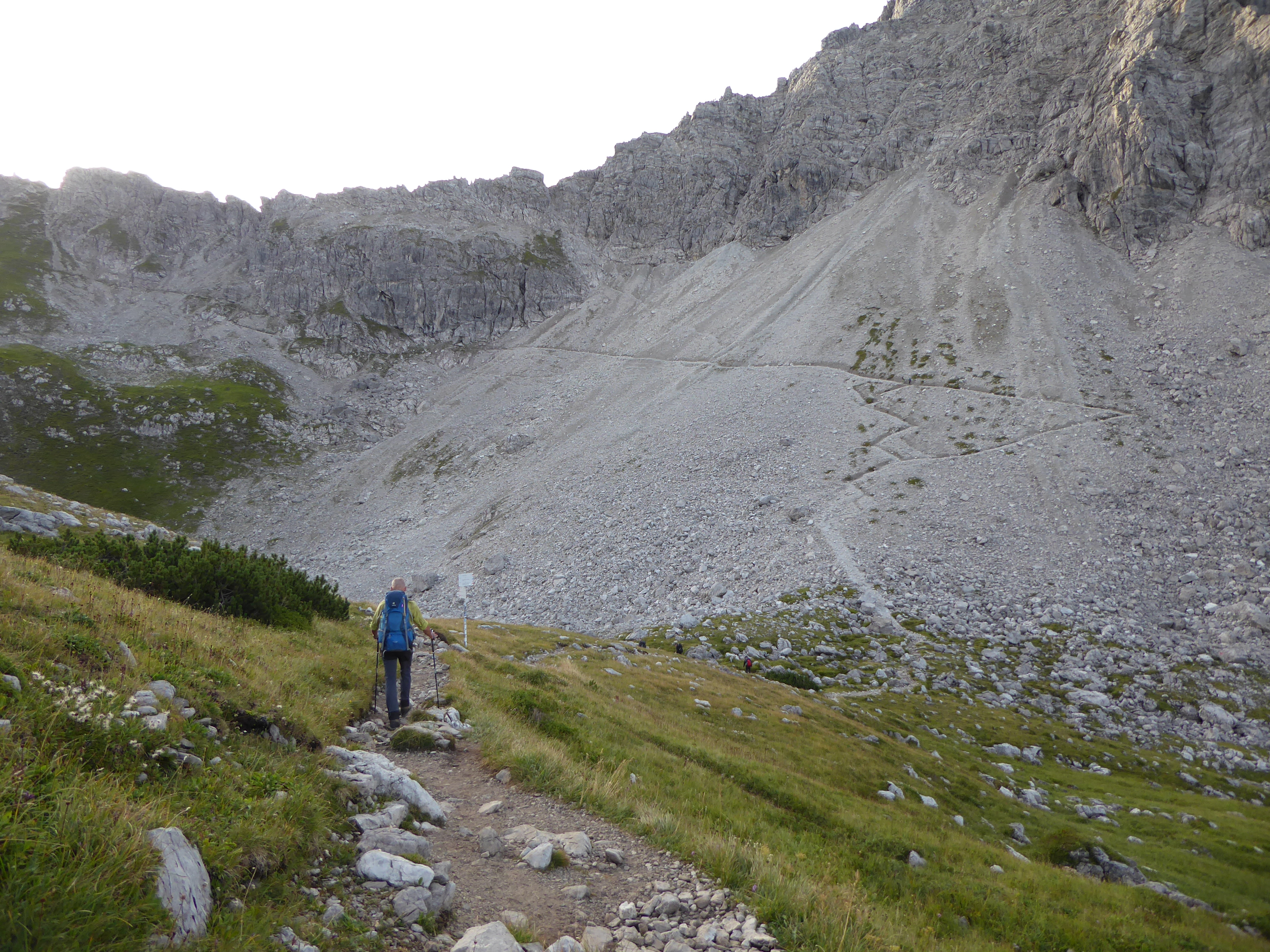 Gut gefrühstückt geht es um 8:30 Uhr zunächst über einen Geröllhang hinauf zur Fiderescharte. Hier ziehen wir unsere Klettersteigsets an. Etwas zu früh, wie sich herausstellt, denn das dort befindliche Stahlseil markiert noch nicht den Klettersteig. Der beginnt erst ein gutes Stückchen weiter.