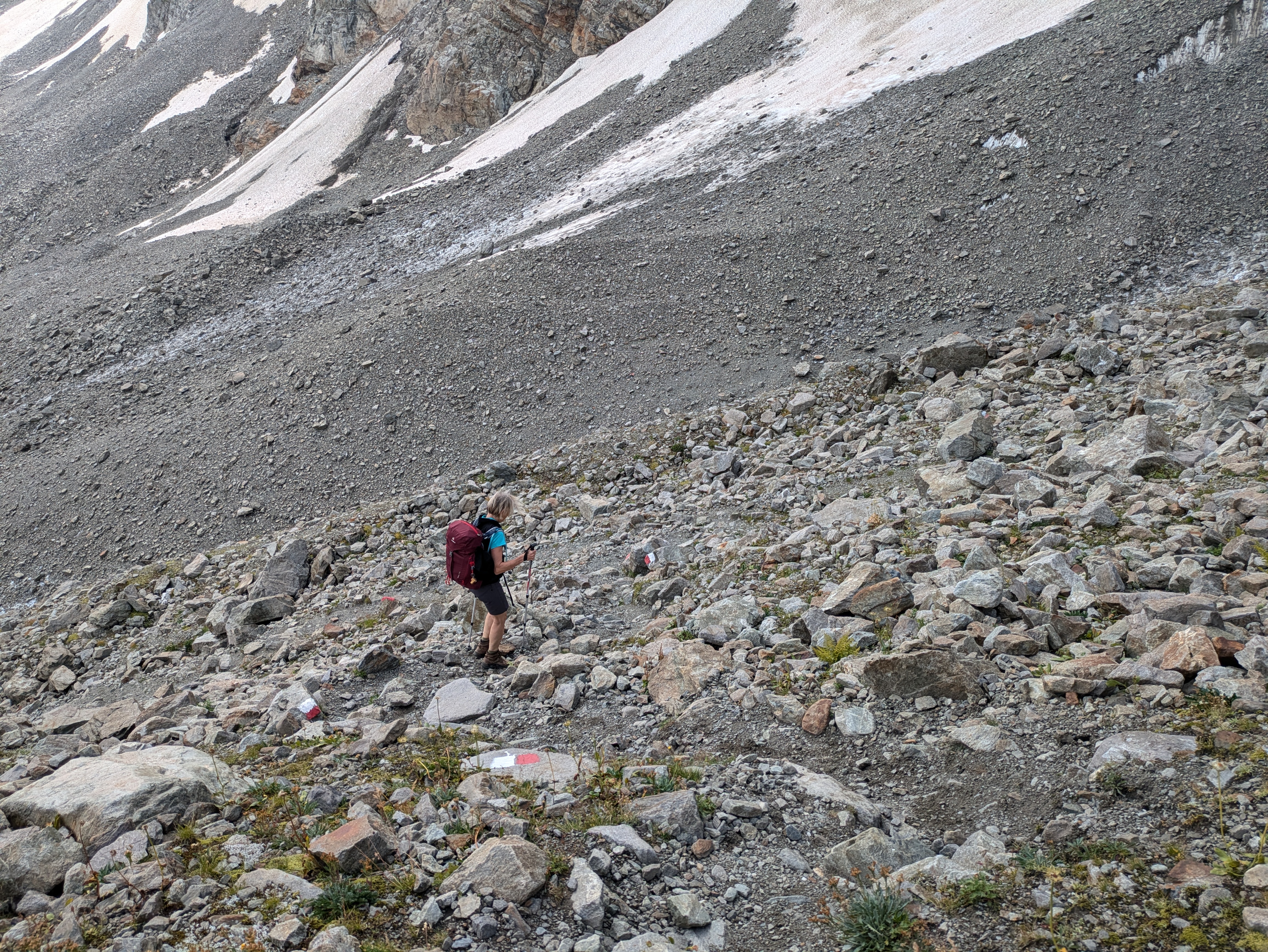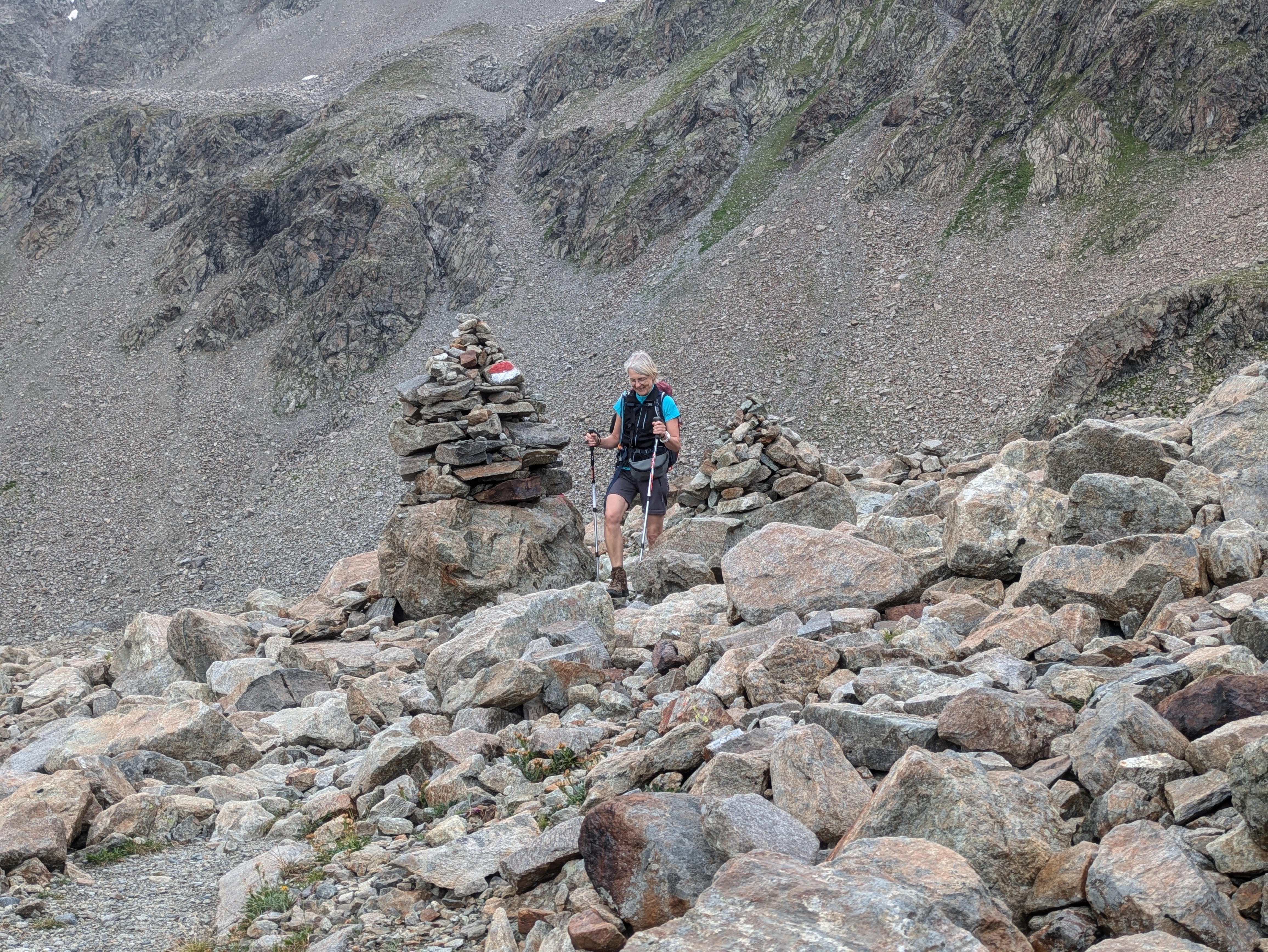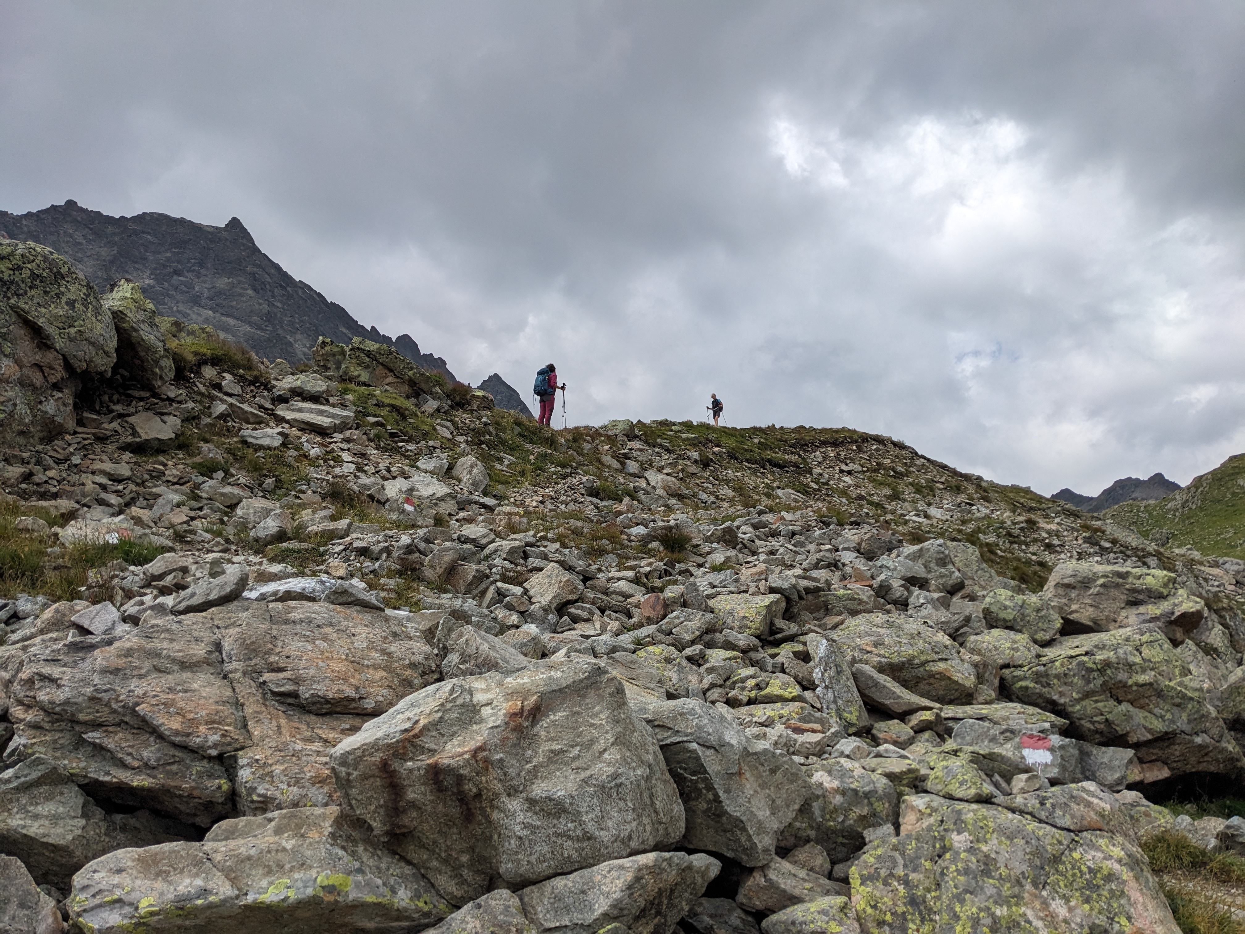 Ab der Brücke geht es für die nächsten 3 Stunden bis zum Kuchenjöchli stetig leicht bergauf. Wechselweise führt uns der Weg durch Wiesen, Latschenkiefern und Blaubeersträucher und ist sehr gut zu laufen. Eine knappe Stunde vor dem Kuchenjöchli machen wir eine kurze Pause, bevor es sodann vermehrt über Blockwerk zum Joch geht.