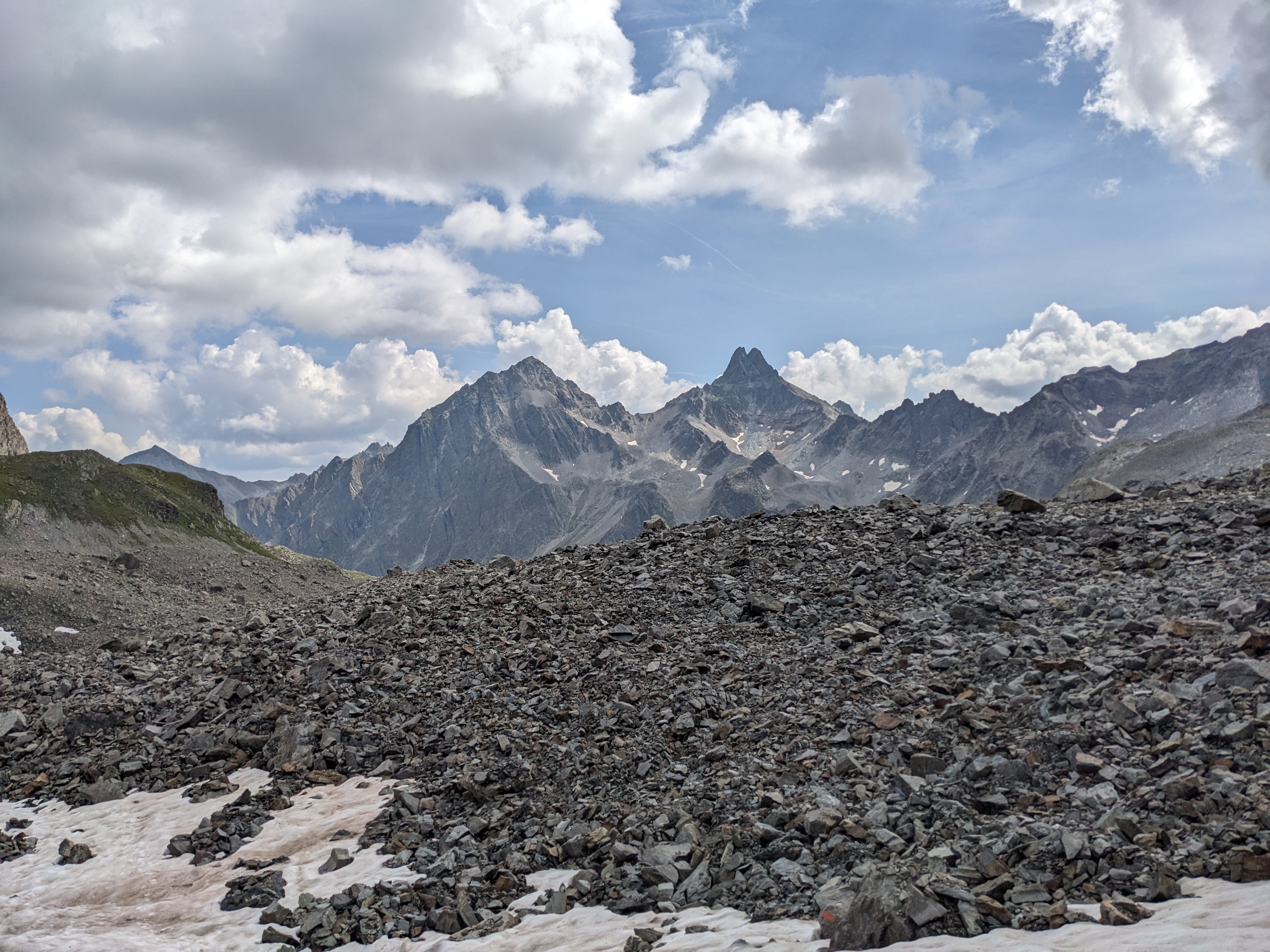 Anschließend folgt des bereits bekannte Blockwerk. Davon gibt es hier eine Menge. Glücklicherweise ist es aber niemals bösartig. Der Blick auf den Kuchenferner wird leider durch eine ansehnliche Menge Schutt auf dem Gletscher getrübt.