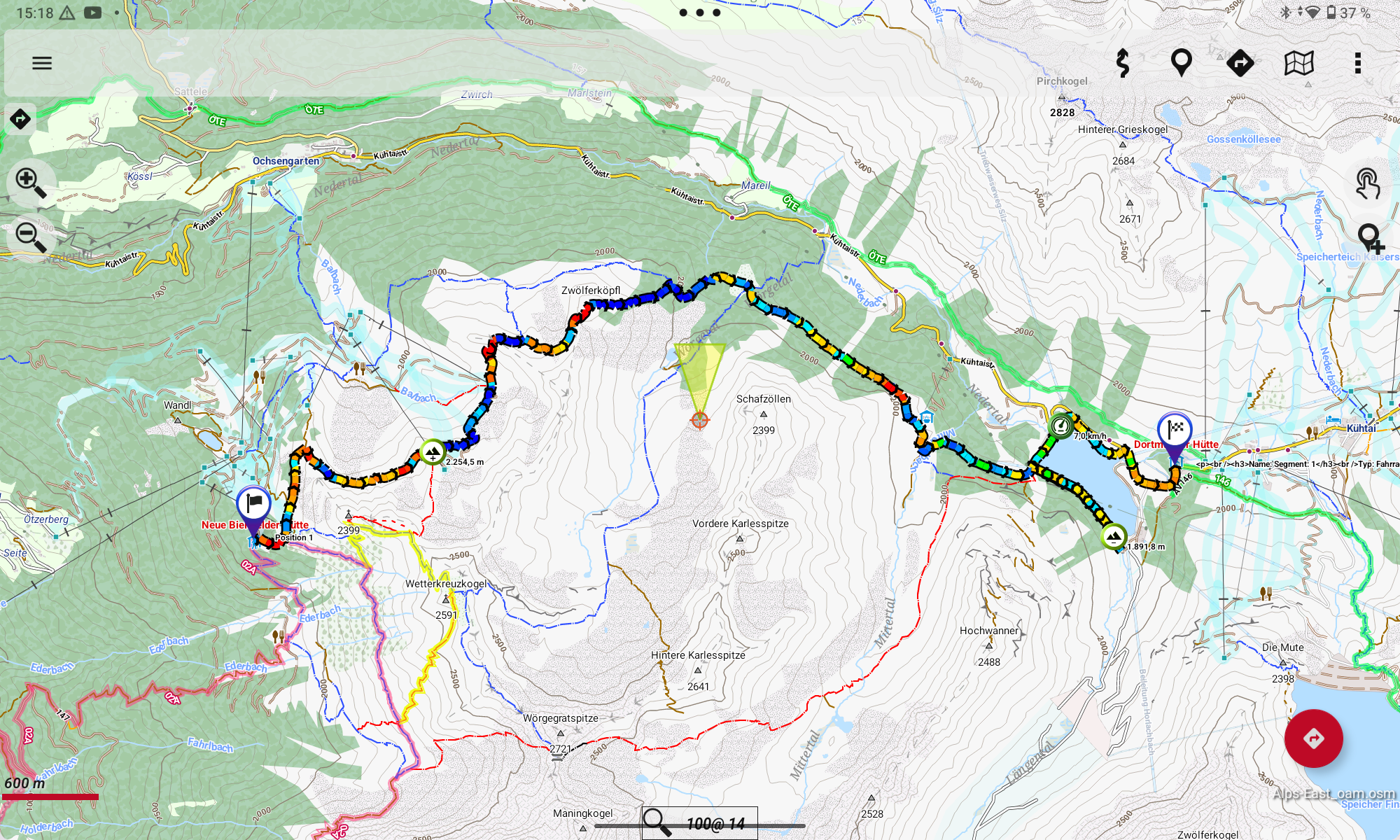 Auf der anderen Seite des Gipfels geht es mal wieder steil (teils über Treppen) herunter. Alsbald passieren wir das Hüttenwerk Wörgetal. Da wir bereits auf 1900hm sind gehen wir davon aus, dass es nun entspannt zur Dortmunder Hütte geht.