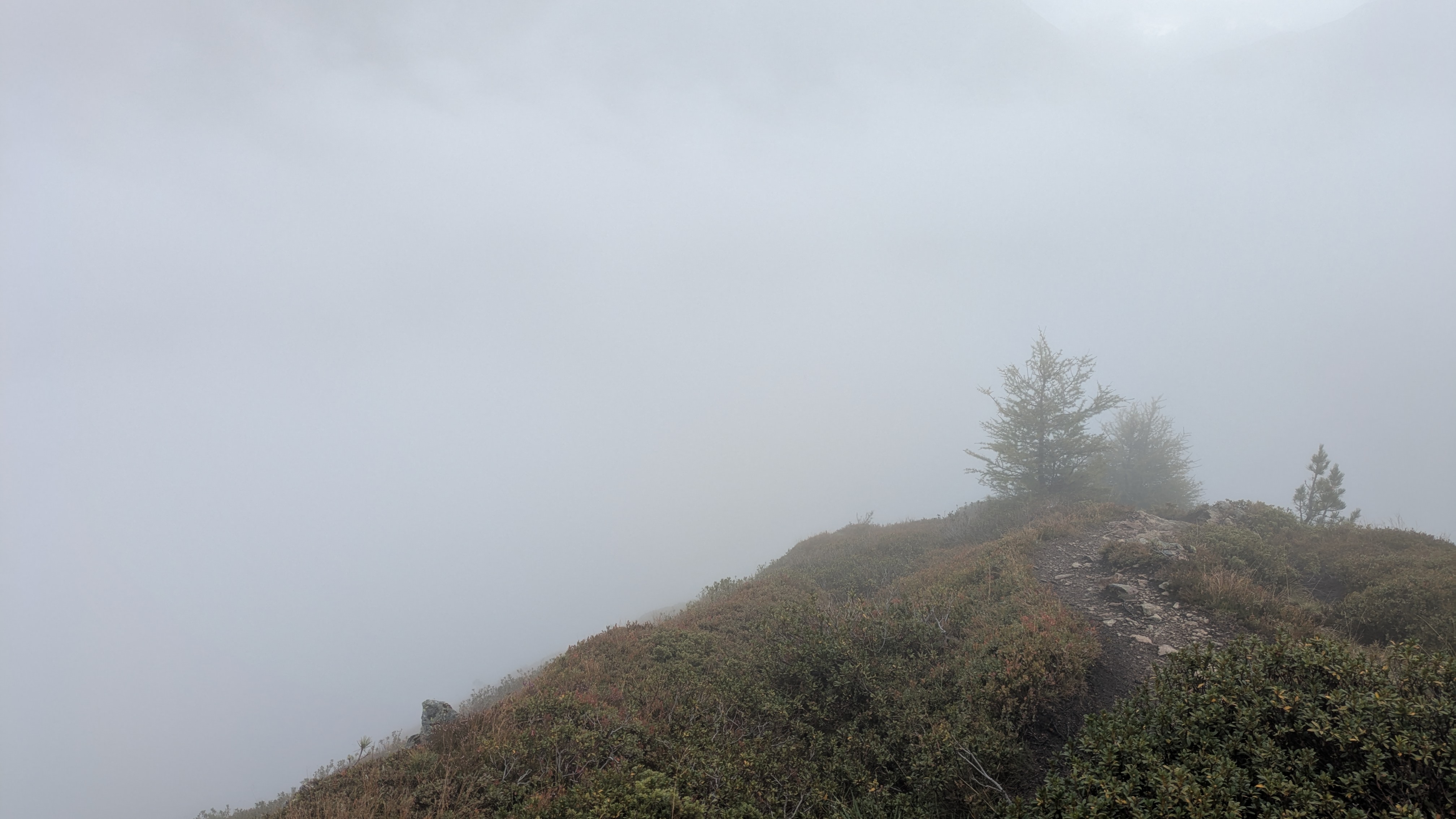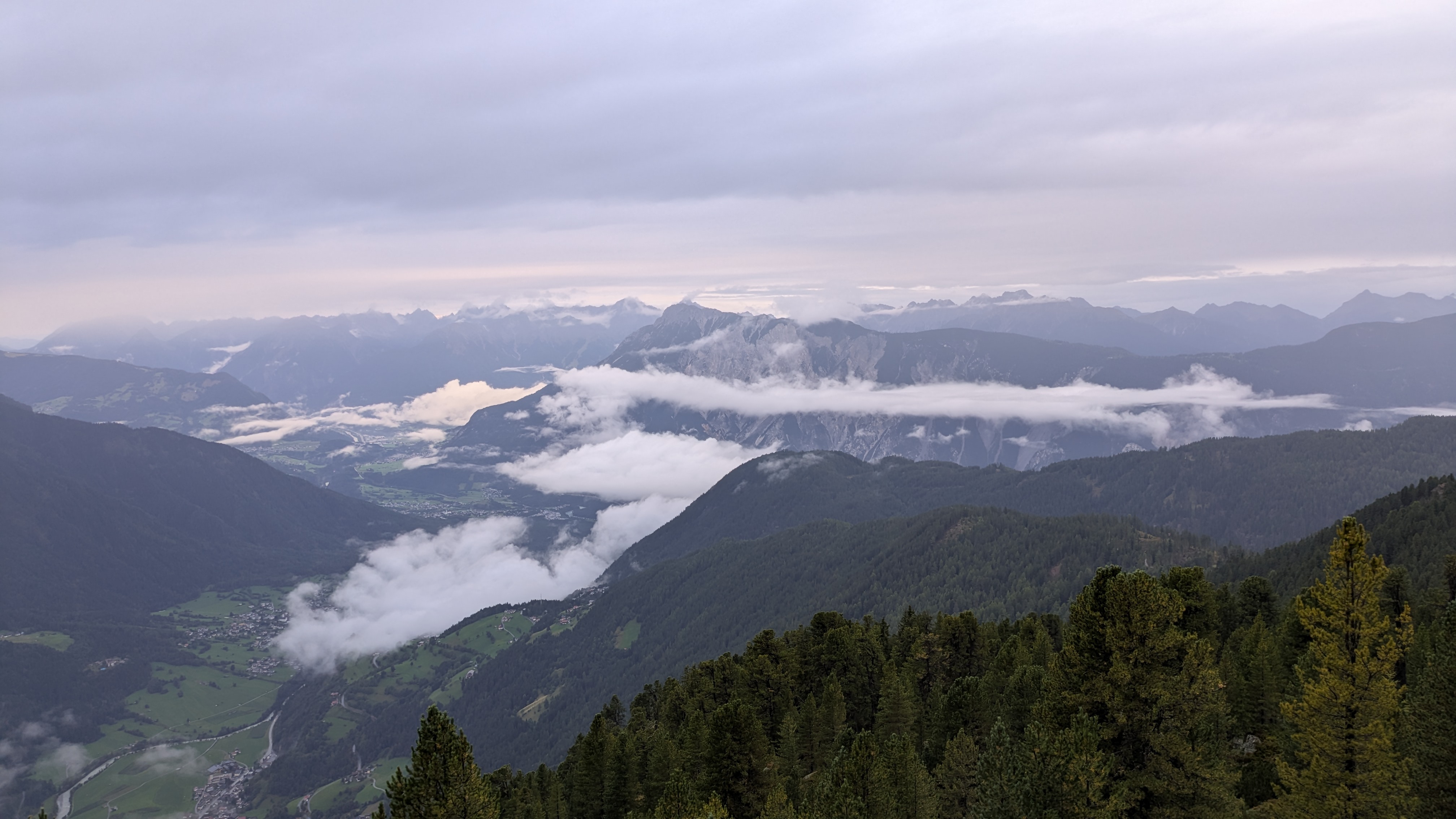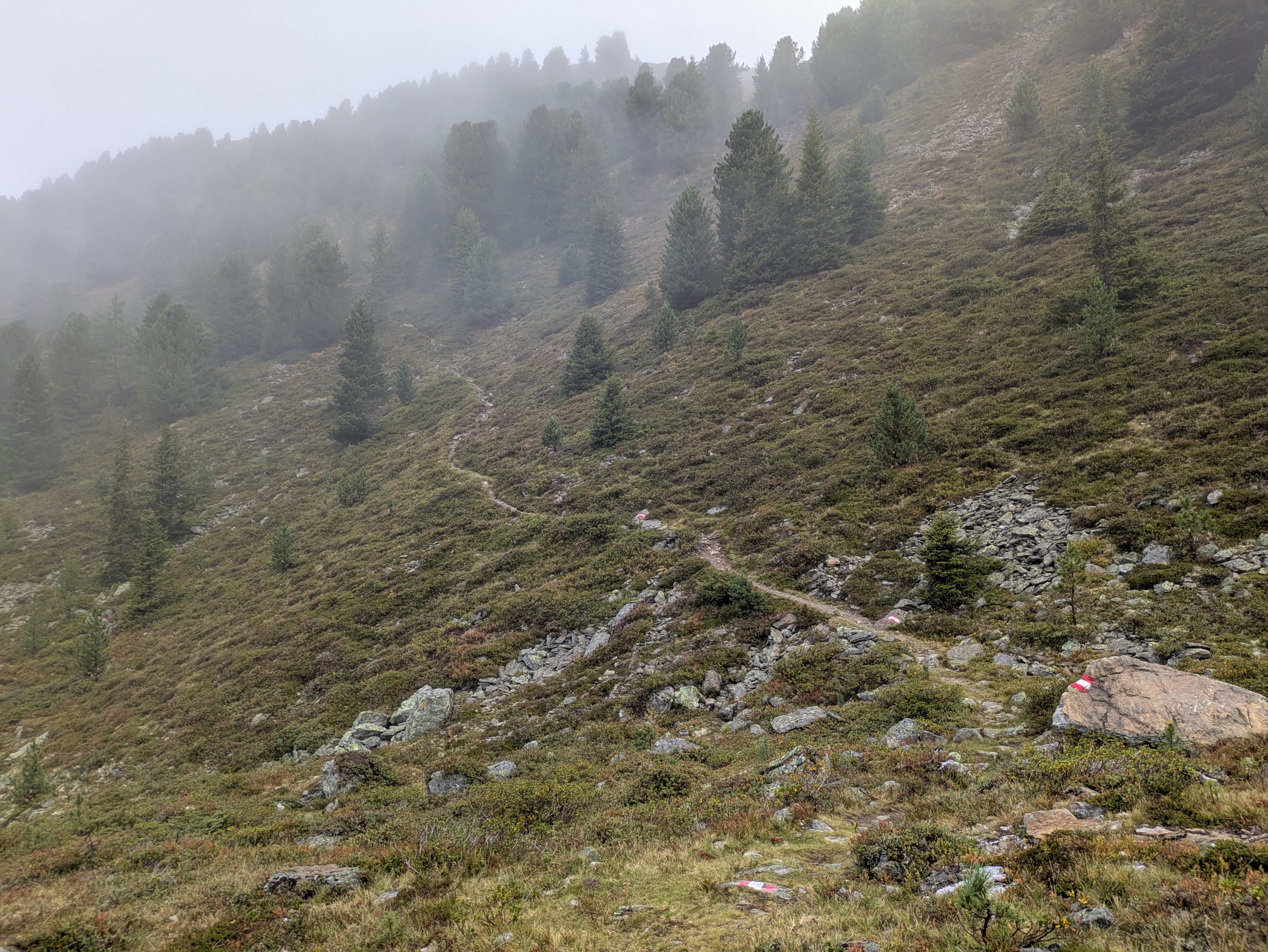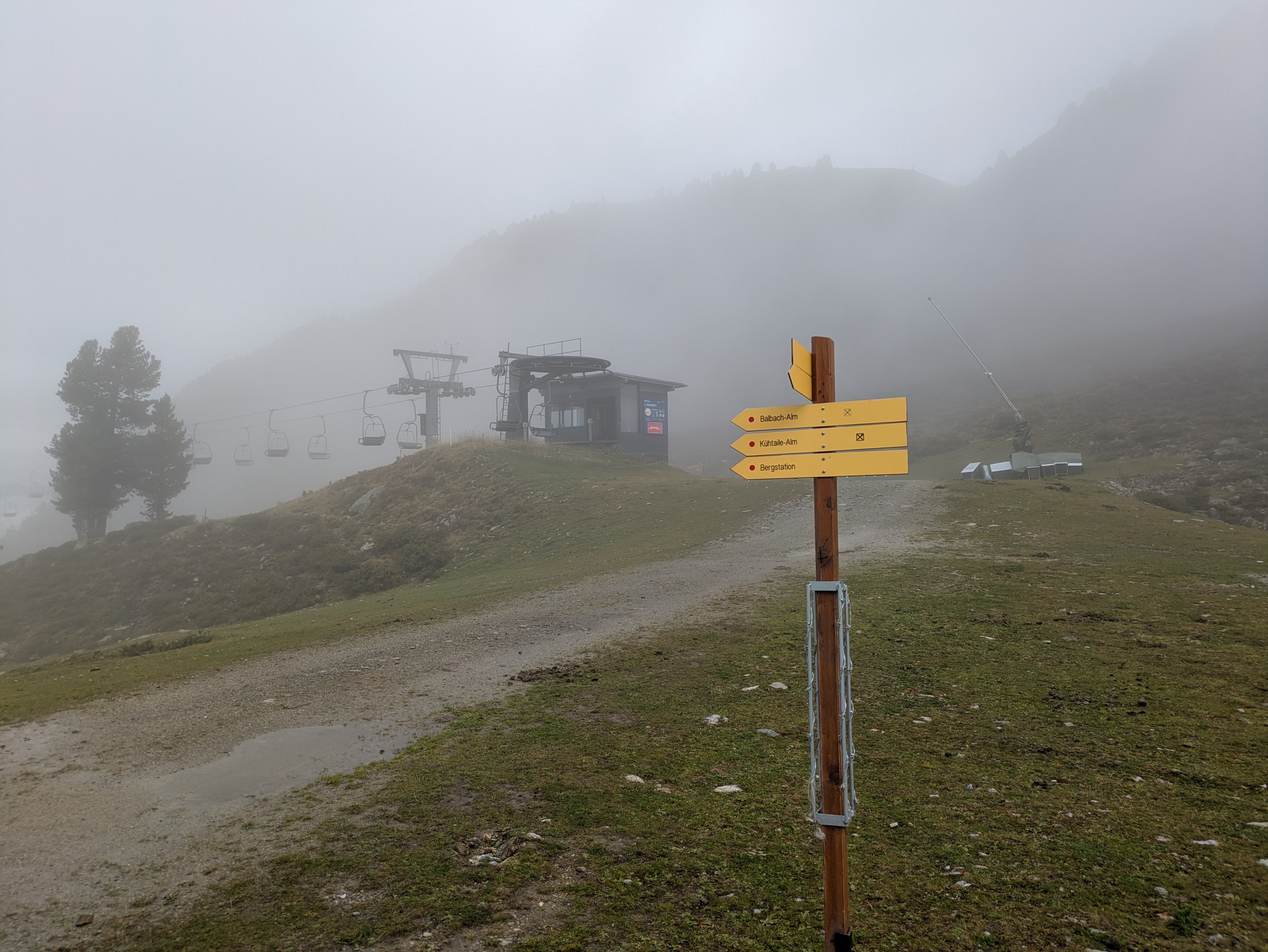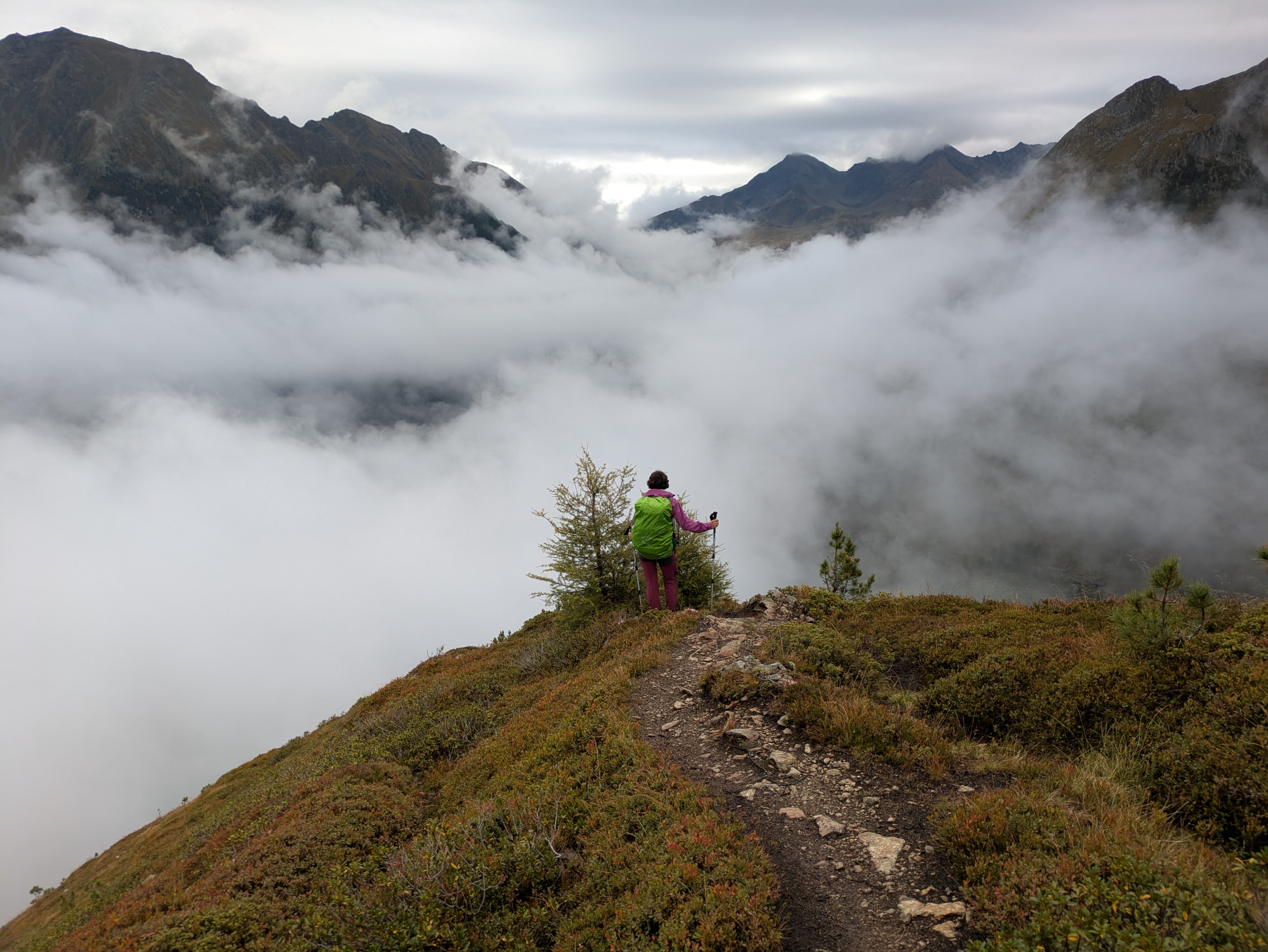 Um 6:30h gibt es Frühstück und da es gegen Mittag auf jeden Fall regnen soll, starten wir 1 Std. früher als sonst. Wir entscheiden uns für den Weg auf halber Höhe zur Balbach Alm, um nicht auf den Wirtschaftswegen laufen zu müssen. Somit geht es direkt ab der Hütte steil die Skiabfahrt hinauf und alsbald nördlich unterhalb der Brunnenkopfbahn weiter. Danach schenkt der Weg nach Westen und das Gelände wird steiler. Bei diesem Wetter ist hier eine gute Konzentration erforderlich, um auf dem schmalen Weg und dem vorhandenen Matsch nicht auszurutschen. Nach dem Einstieg zum Rosskopfklettersteig (B/C, 210hm) wird es wieder einfacher. Ab der Bergstation der Wetterkreuzbahn geht es ein kurzes Stück über einen Fahrweg zur Bergstation Balbach. Nun wird es richtig steil – glücklicherweise nur für ungefähr 50hm. Im Anschluss führt uns der Weg angenehm weiter zum Zwölferköpfel. Durch die immer wieder aufsteigenden Nebelschwaden bietet sich ein mystisches Bild.