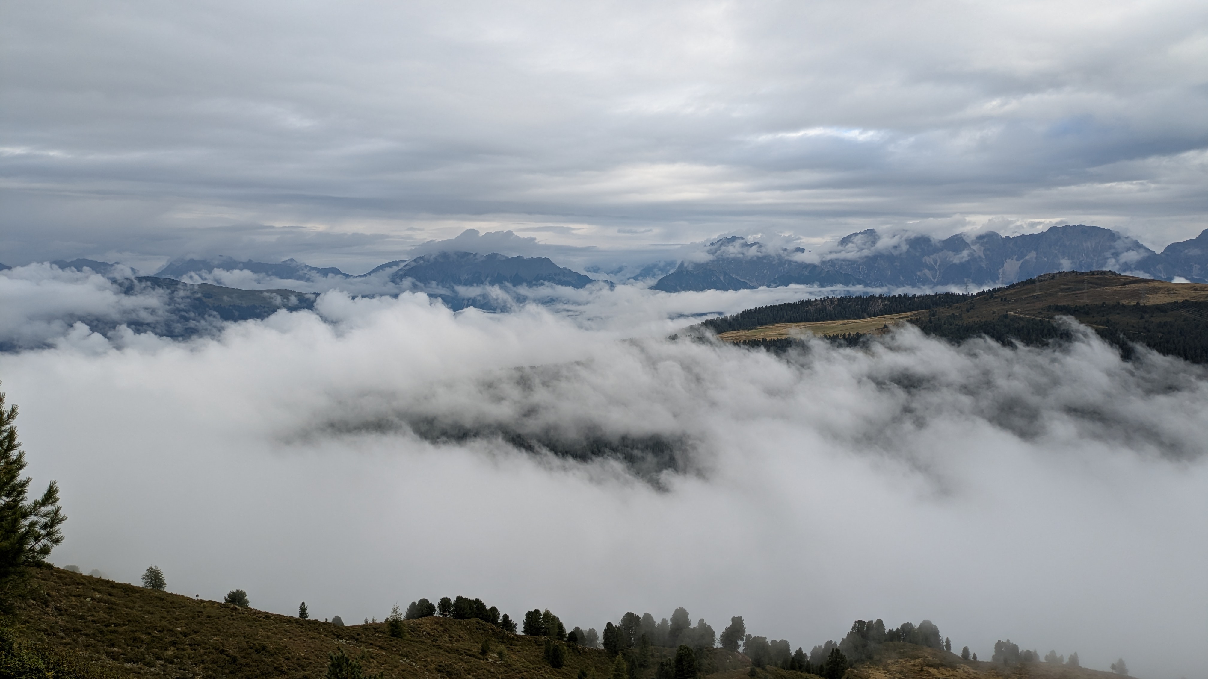 Alles in allem haben wir an diesem Tag dennoch Glück gehabt. Es hätte schlimmer kommen können. Am Nachmittag zieht ein dickes Regengebiet durch und es schneit bis auf 2100m hinab.