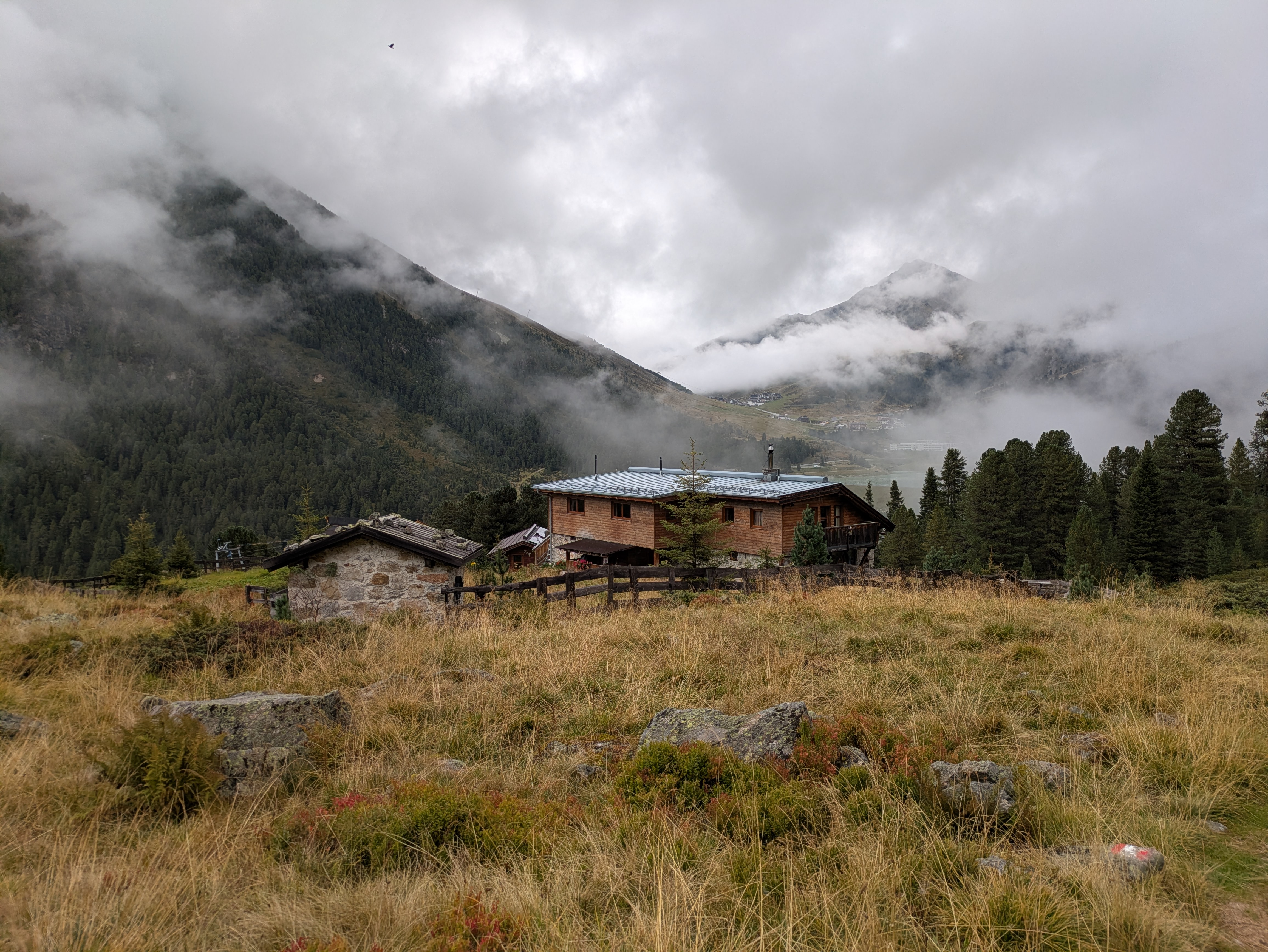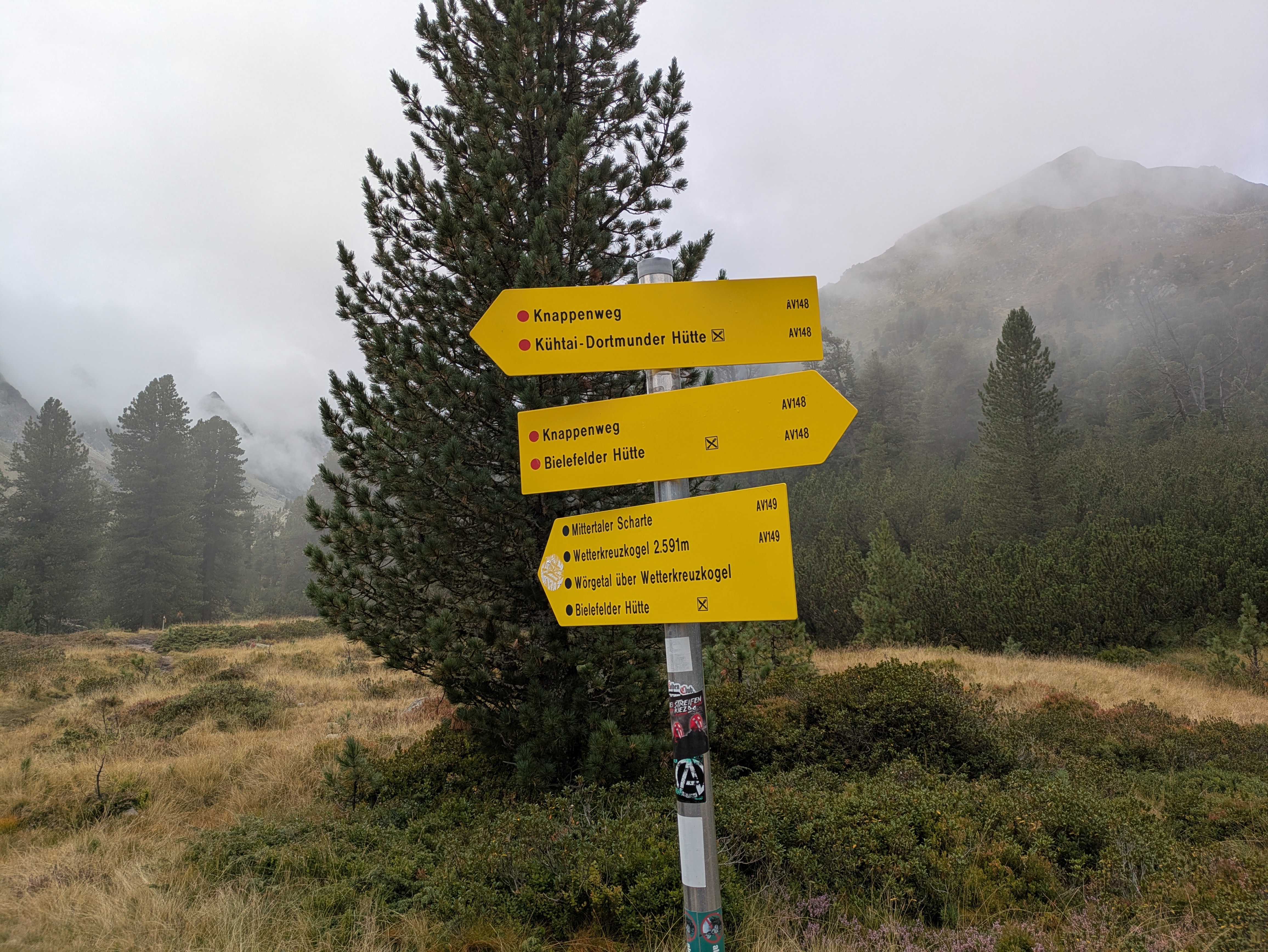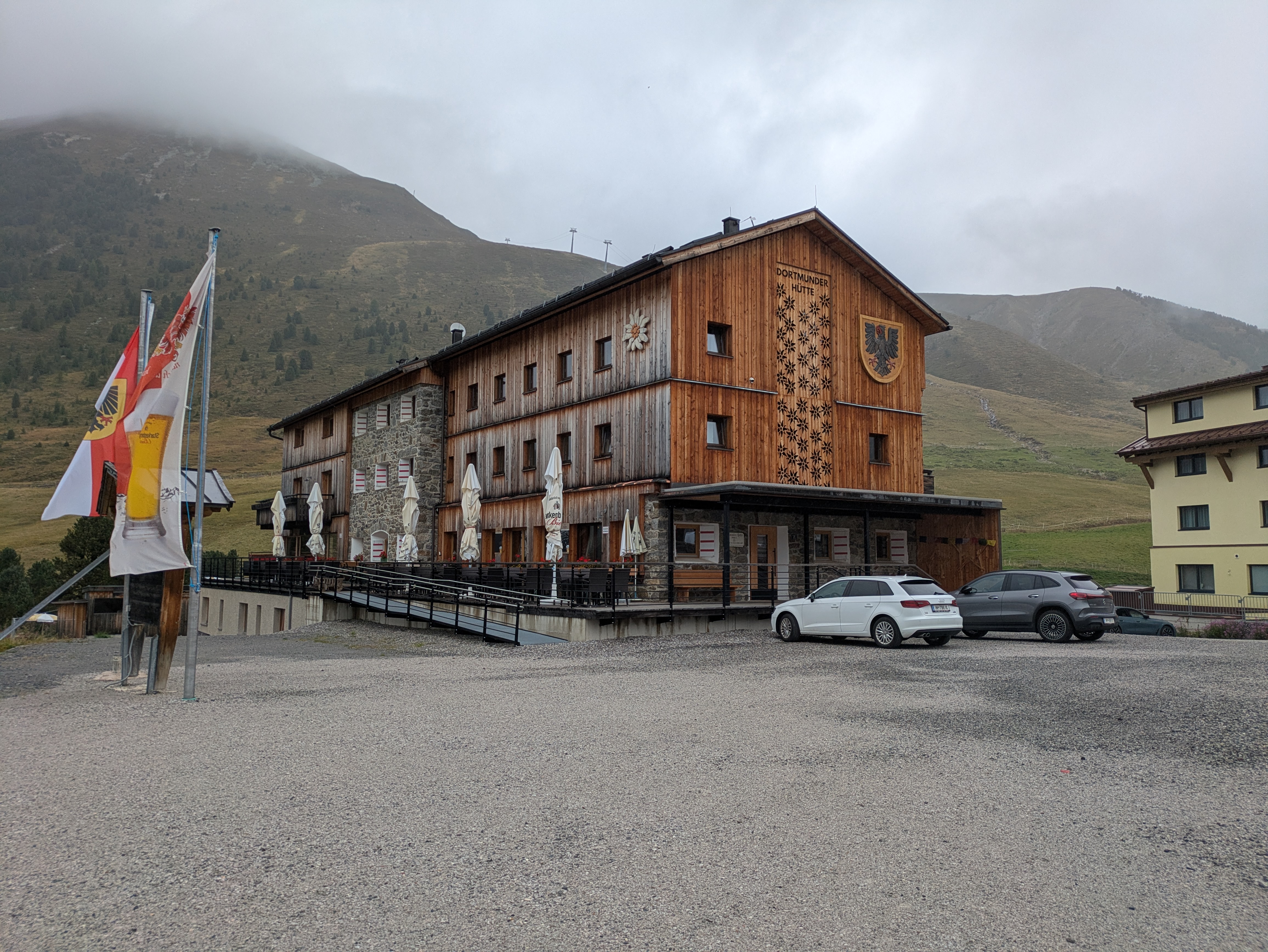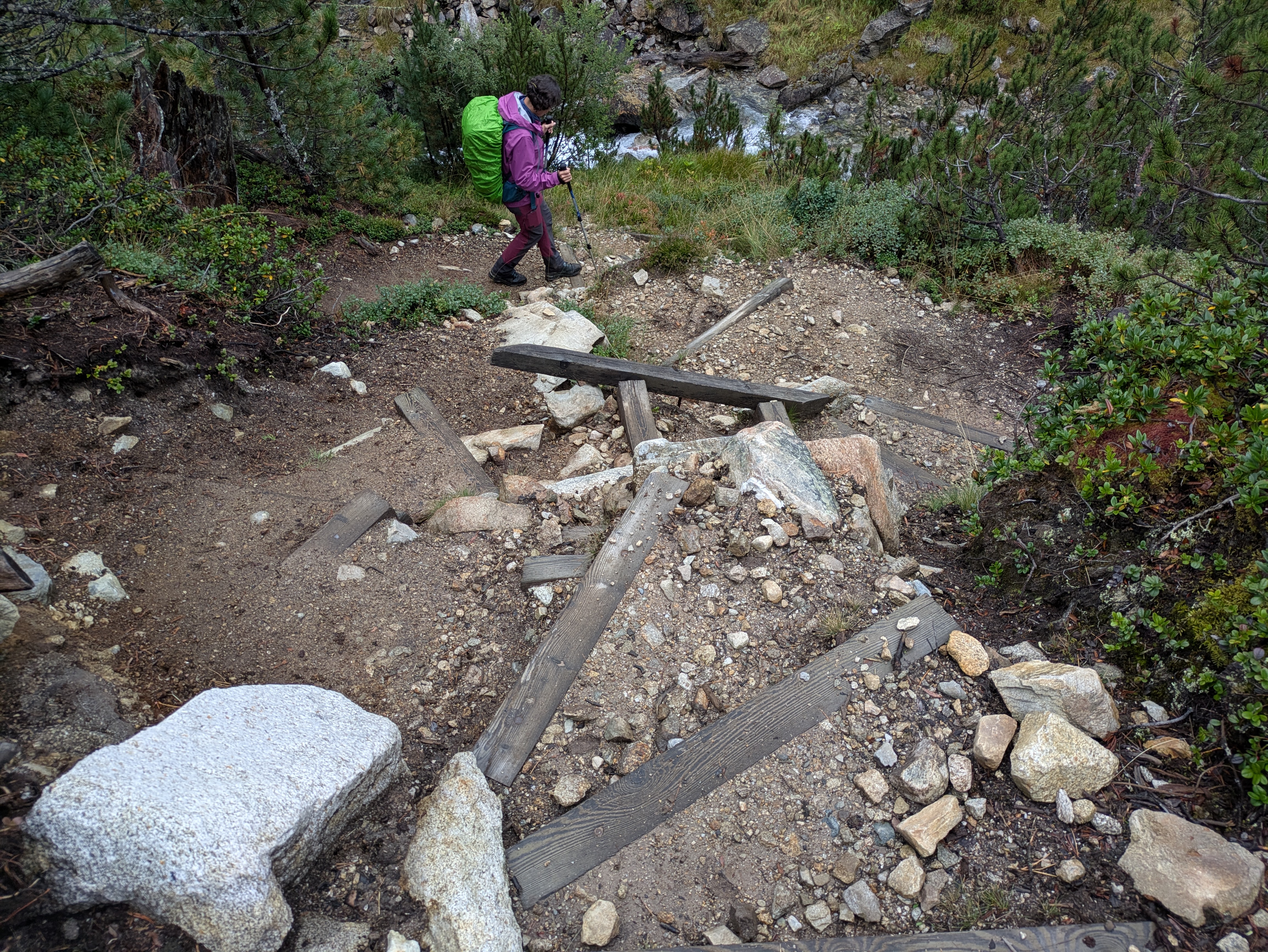 Auf der anderen Seite des Gipfels geht es mal wieder steil (teils über Treppen) herunter. Alsbald passieren wir das Hüttenwerk Wörgetal. Da wir bereits auf 1900hm sind gehen wir davon aus, dass es nun entspannt zur Dortmunder Hütte geht.